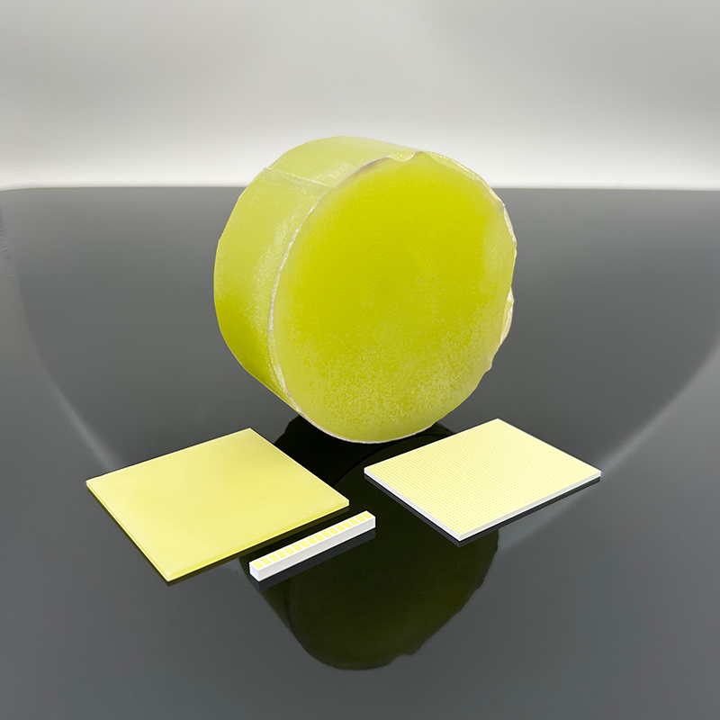 GOS(Gd2O2S)陶瓷型闪烁晶体材料,其主发光峰位于512 nm、半透明、密度 7.34g/cm3、光输出高、余辉3 ms小于0.1%、耐湿性高、不含有毒物质、易于加工。根据掺杂剂不同可分为GOS(Tb)和GOS(Pr),广泛应用于X射线的货物检测器、异物检测器、分析检测器、放射线检测器、核医学影像系统、工业探测等领域。